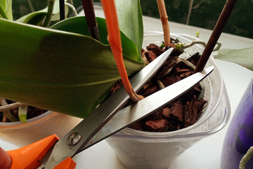 Vor dem Schneiden empfiehlt es sich, einige Wochen zu warten, um zu überprüfen, ob auf dem verblühten Trieb zusätzliche Blütentriebe erscheinen. Wenn uns die Ästhetik wichtig ist, kann der vertrocknete Teil des Stiels direkt am dicksten Auge gekürzt werden; Der gesamte trockene Trieb sollte mit einer kleinen Gartenschere an der Basis abgeschnitten werden, wobei darauf zu achten ist, dass die Blätter nicht beschädigt werden. Gesunde Blätter werden nicht abgeschnitten – sie sind für die Photosynthese notwendig; nur gelbe oder kranke Blätter werden entfernt, indem man sie an der Basis abschneidet und die Schnittstelle beispielsweise mit Zimt bestreut, der antibakterielle Eigenschaften hat.